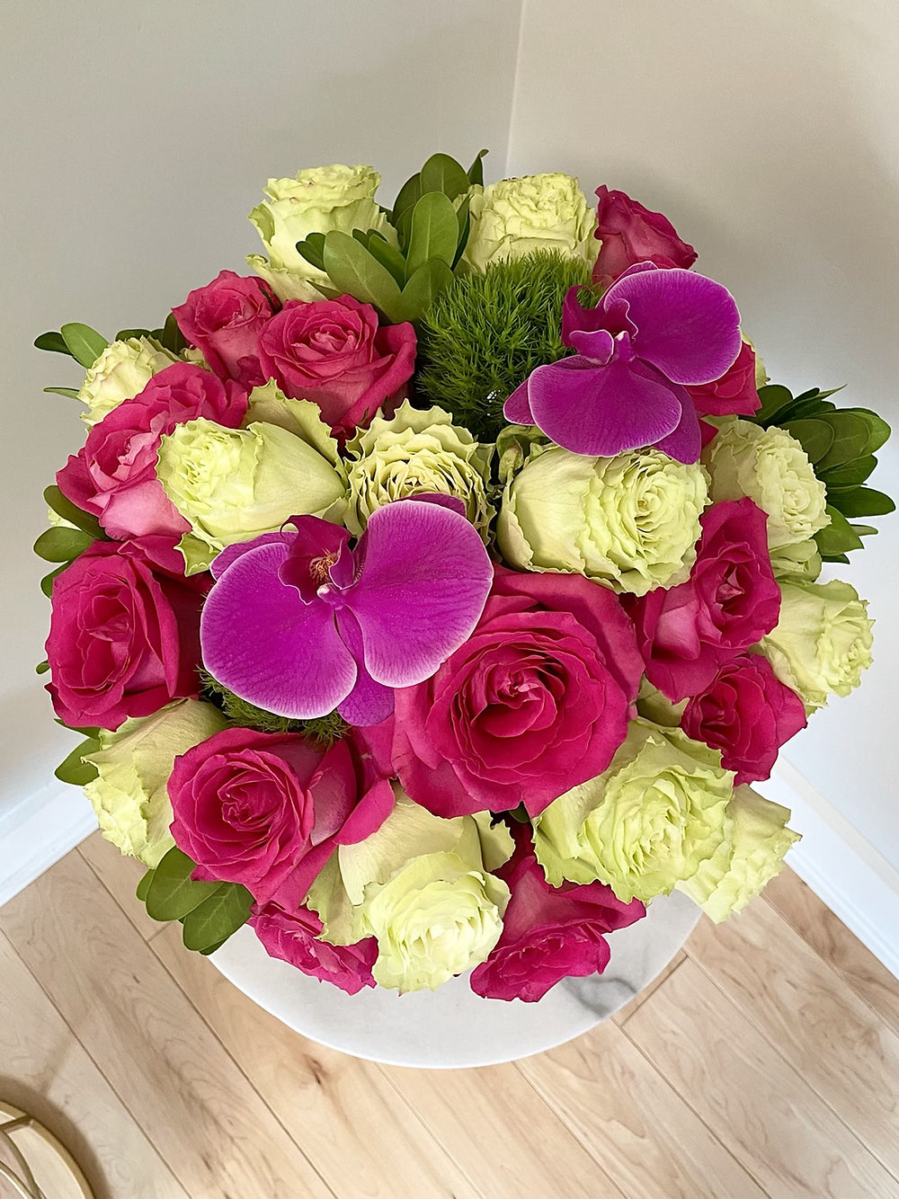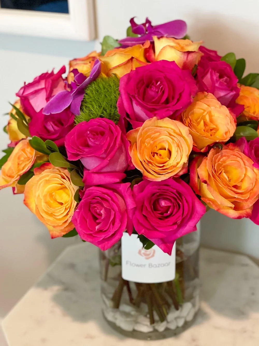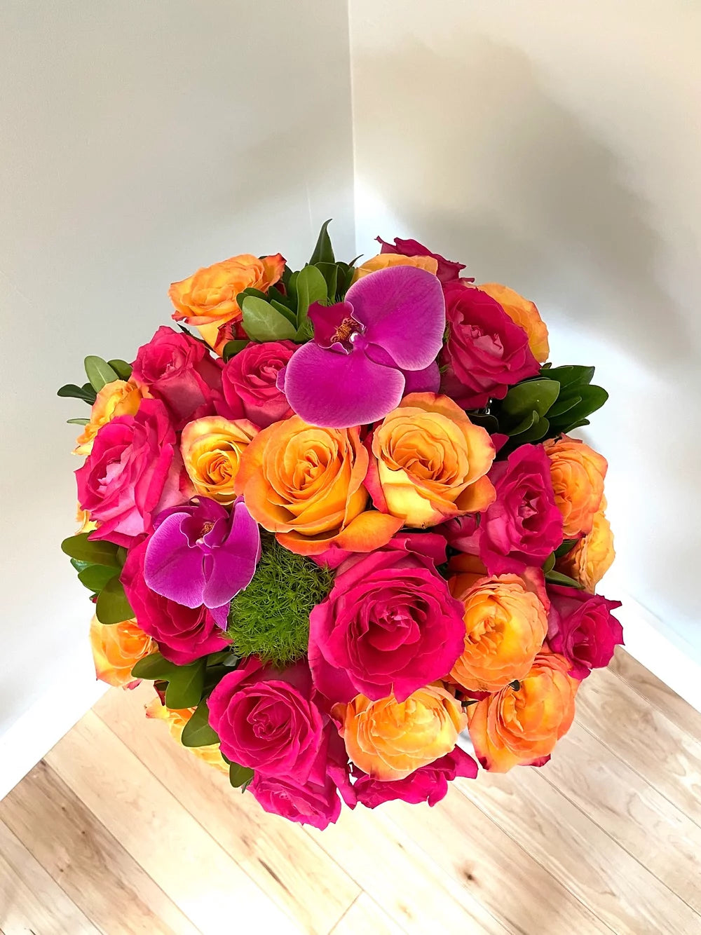 The Candy is a one-of-a-kind bouquet featuring a mix of different colorful flowers (Mainly Roses) and greens.
