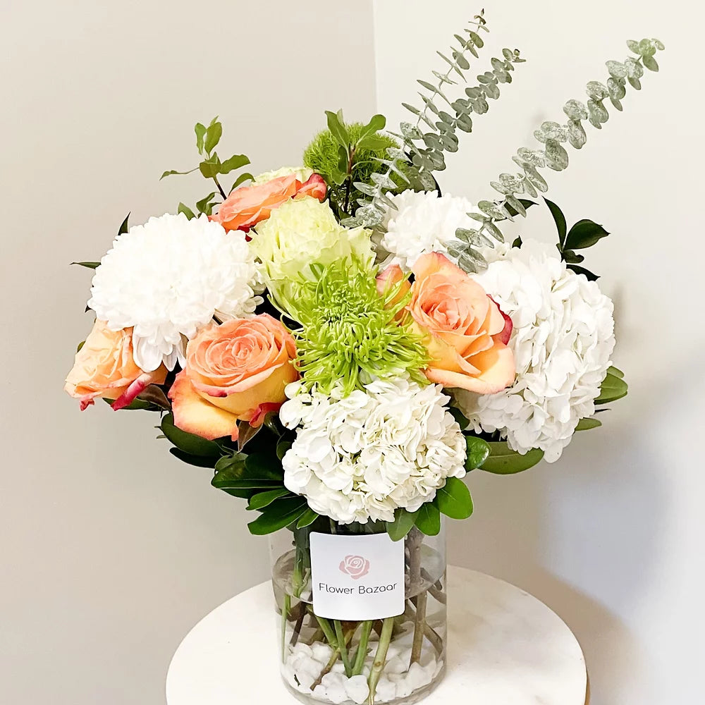 Hydrangeas, roses, spider and fresh greenery